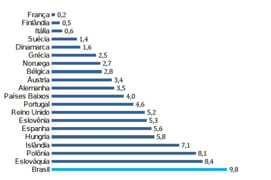 O país figura entre os países emergentes com maior carga tributária, que em 2024 ultrapassou 34% do PIB, segundo cálculos do Ibre-FGV